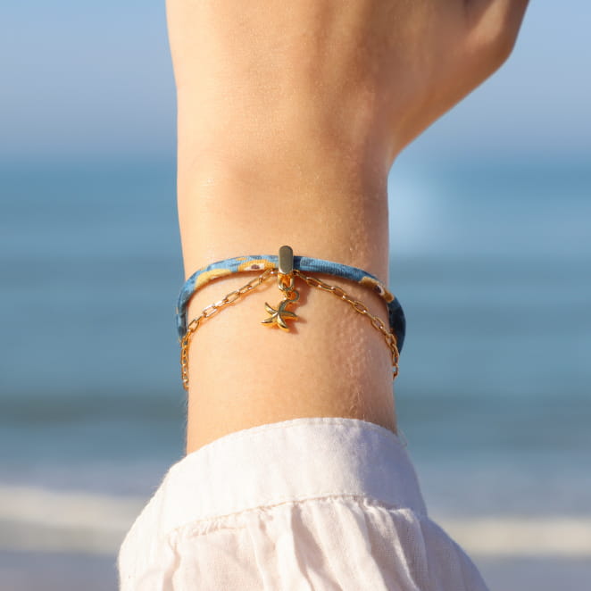 Laissez-vous porter par l’esprit nature et le charme du bord de mer avec le bracelet Tamara. Ce multirang allie avec harmonie des tons bleus et des touches dorées, pour un bijou lumineux et fait main. Parfait pour évoquer l’évasion et les vacances, ce bracelet apporte une touche d’authenticité à chaque instant.