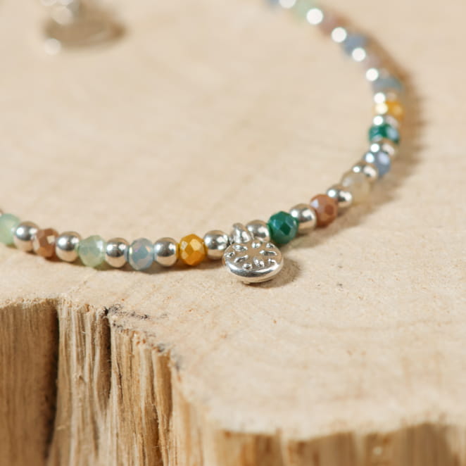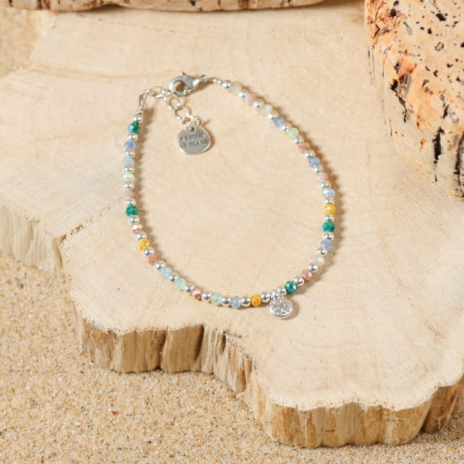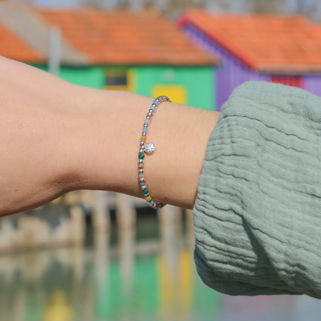 Plongez dans l'atmosphère envoûtante de la mer avec le bracelet Trieste, une véritable invitation au voyage. Ce bracelet femme se distingue par sa combinaison parfaite de couleurs pastel et d'éclats argentés, créant un jeu harmonieux de nuances qui rappellent les vagues scintillantes et les paysages marins. Les perles en verre multicolore, dans des tons doux de bleu, rose, vert et jaune, s'entrelacent délicatement pour capturer la beauté changeante et magique de la mer. Que ce soit pour une promenade sur la plage ou une soirée en bord de mer, le bracelet Trieste vous accompagnera avec élégance où que vous alliez.