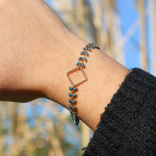 Inspirée par la délicatesse des fleurs du Troene du Japon, ce bracelet couleur bronze bleu gris sera des plus élégants, porté seul ou en accumulation ! Ce bracelet est un intemporel, qui s'accorde à toutes vos tenues, tout au long de l'année. Tendance et élégant avec sa chaine bronze allié à un pendentif carré, ce bracelet vous accompagne au quotidien !