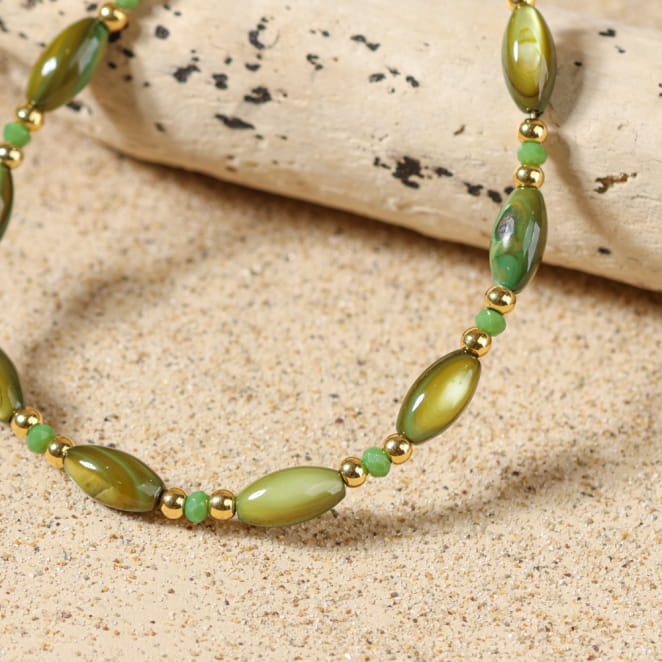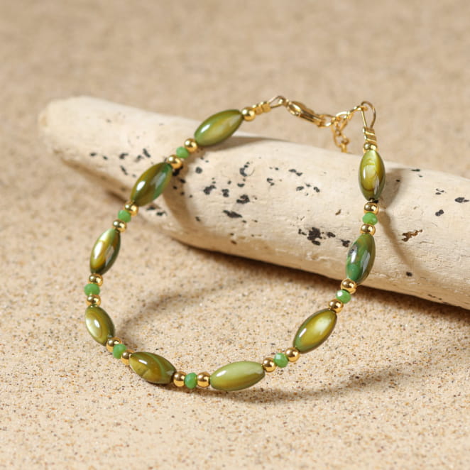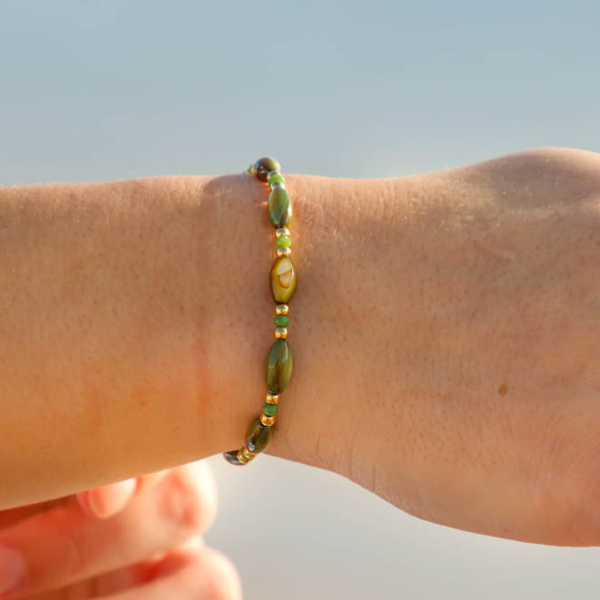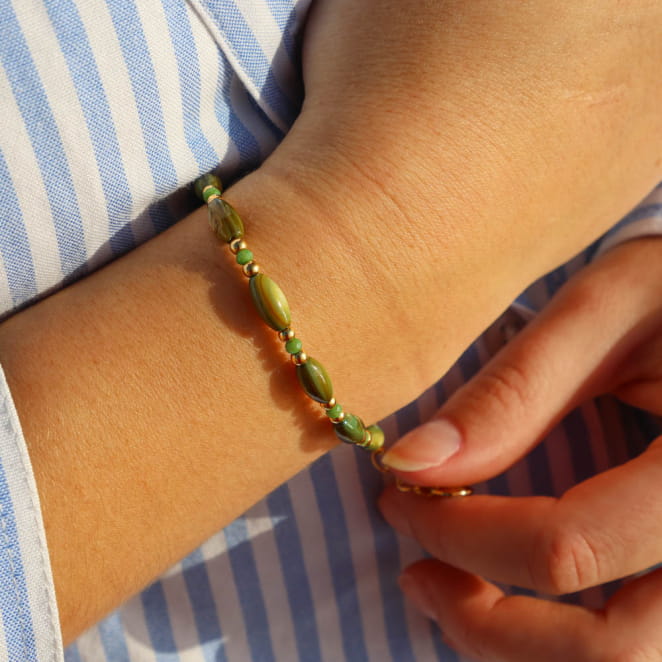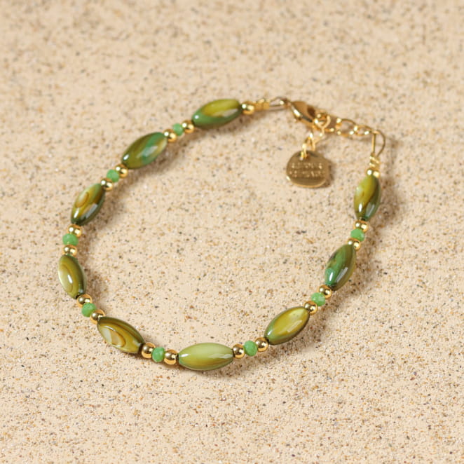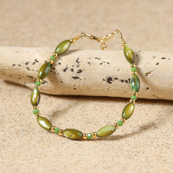 Sublimez votre poignet avec le bracelet Tuvalu, inspiré des lumières marines et des reflets dorés d'un coucher de soleil. Confectionné avec des perles de nacre et des perles en verre vert, ainsi que de délicates touches dorées, il évoque les trésors ramenés d'une balade en bord de mer. Ce bijou délicat vous accompagne au quotidien, pour un style naturel et raffiné qui rappelle l'évasion des plages.