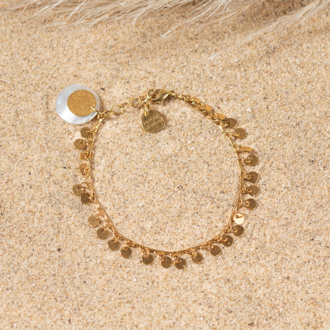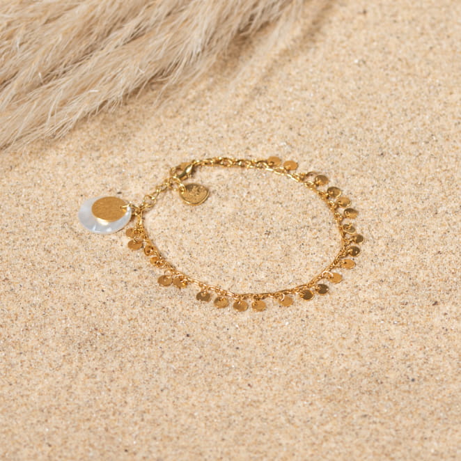 Optez pour un style bohème avec notre bracelet doré Tzigane. Un bijou pour femme tendance et élégant composé d'une chaîne dorée et d'un pendentif rond en nacre blanc. Un accessoire agréable à porter au quotidien.
