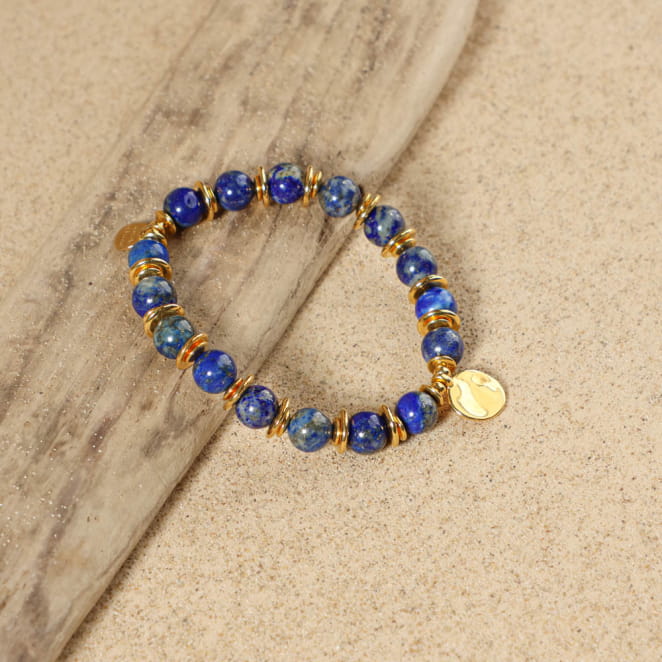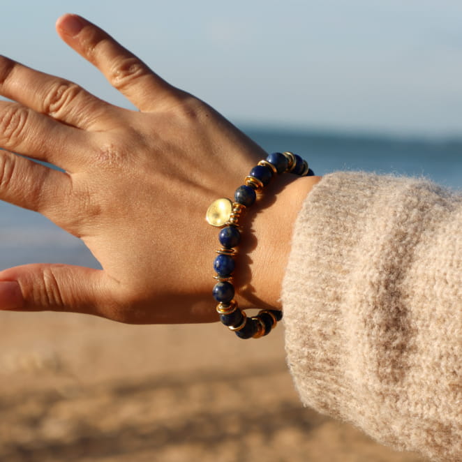 Ajoutez une touche d’élégance marine à votre poignet avec le bracelet bleu marine et doré Valentina, conçu en perles de lapis-lazuli. Véritable hommage aux trésors de la nature, il allie profondeur des couleurs et simplicité raffinée. Ce bracelet élastique se compose de perles rondes en lapis-lazuli, connues pour leurs nuances intenses et leurs éclats dorés naturels, associés à des perles dorées pour un contraste harmonieux. Son design épais et sa conception soignée en font une pièce à la fois robuste et sophistiquée, idéale pour sublimer toutes vos tenues. Ce bijou évoque les nuits étoilées au bord de l’océan, parfait pour celles et ceux qui aiment l’élégance naturelle et les belles matières. Succombez à l’intensité du bleu marine et laissez-vous emporter par l’élégance intemporelle de ce bijou !