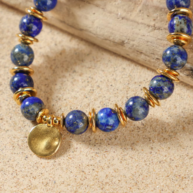 Ajoutez une touche d’élégance marine à votre poignet avec le bracelet bleu marine et doré Valentina, conçu en perles de lapis-lazuli. voir plus