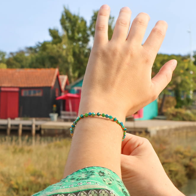 Découvrez le bracelet Vallée, une ode à la nature avec ses douces perles brillantes dorées et émeraudes. Un bijou délicat qui allie élégance et harmonie, capturant l'esprit des paysages enchanteurs.