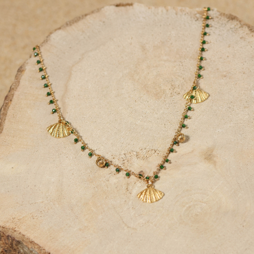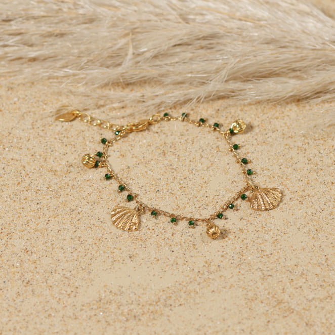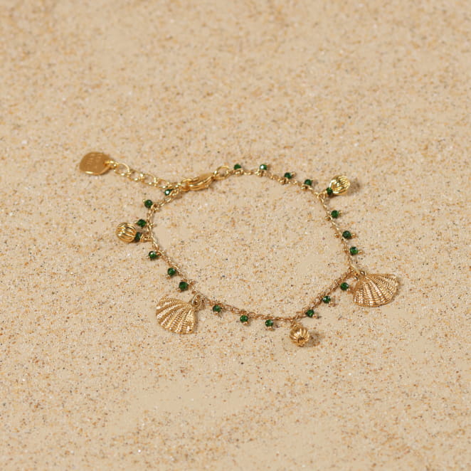 Profitez du soleil jusqu’au bout des poignets. Le bracelet, Verseau, est une invitation se balader sur le sable. Sa chaîne légère, ponctuée de petits grelots verts et de perles dorées, danse autour du poignet avec délicatesse. Deux pendentifs coquillage dorés ajoutent une touche marine raffinée, tandis que la médaille Retour de Plage vient signer ce bijou en toute simplicité. À porter en vacances ou dès les premiers beaux jours, ce bijou devient un incontournable. Lumineux, joyeux et facile à assortir, il accompagne aussi bien vos tenues de saison estivale comme hivernale.