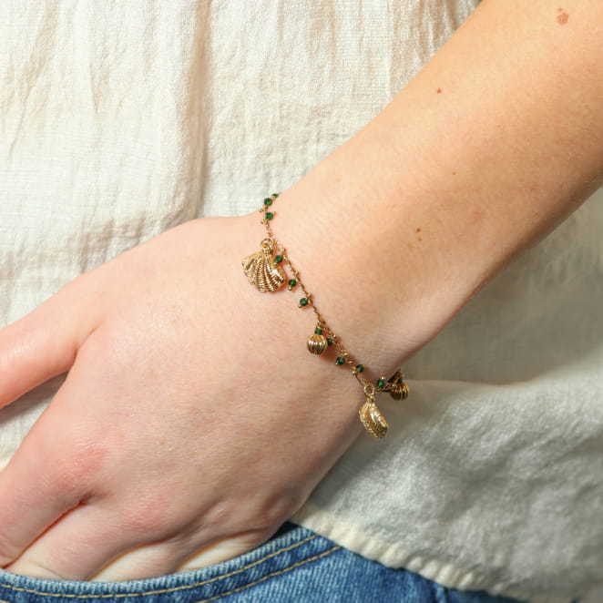 Profitez du soleil jusqu’au bout des poignets. Le bracelet, Verseau, est une invitation se balader sur le sable. Sa chaîne légère, ponctuée de petits grelots verts et de perles dorées, danse autour du poignet avec délicatesse. Deux pendentifs coquillage dorés ajoutent une touche marine raffinée, tandis que la médaille Retour de Plage vient signer ce bijou en toute simplicité. À porter en vacances ou dès les premiers beaux jours, ce bijou devient un incontournable. Lumineux, joyeux et facile à assortir, il accompagne aussi bien vos tenues de saison estivale comme hivernale.