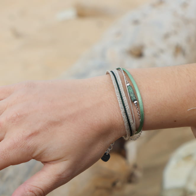 Découvrez le bracelet multibrins Wakame : une fusion unique de lin, satin, et métal. Arborant des tons verts et naturels, ce bijou évoque la connexion à la nature. Agrémenté d'une pierre tube turquoise élégante, il sublime votre côté naturel et dévoile une harmonie subtile entre sophistication et rusticité, pour une allure authentique et envoûtante.