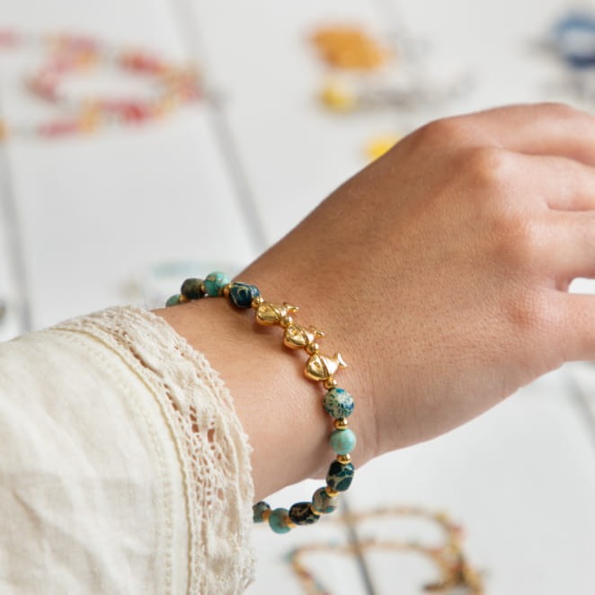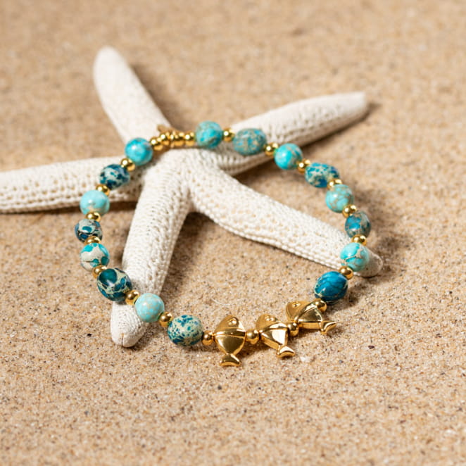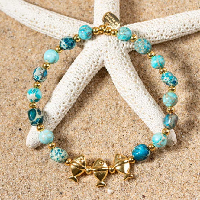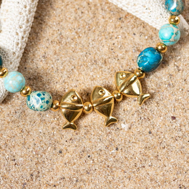 Laissez-vous séduire par le bracelet Warda, un bijou éclatant qui allie élégance et fantaisie, avec des perles en jaspe impérial bleu turquoise et des petits poissons dorés qui ajoutent une touche ludique et classe à votre style. Parfait pour illuminer votre tenue avec une note de sophistication et d'originalité.