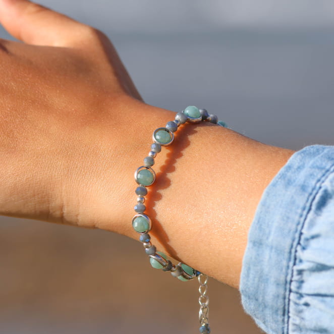 Le bracelet Yeti, argenté orné de perles en verre bleu ciel capte la lumière comme un doux reflet d'été. Subtil et raffiné, il joue avec les reflets argentés pour évoquer l'éclat du soleil sur l'eau. Chaque perle en verre ajoute une touche de brillance. À porter seul ou en accumulation, ce bijou insuffle un esprit de vacances intemporel, parfait pour prolonger l'été.