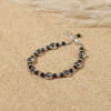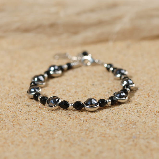 Le bracelet Yeti, argenté orné de perles en agate et terahertz noir capte la lumière comme un doux reflet d'été. Subtil et raffiné, il joue avec les reflets argentés pour évoquer l'éclat du soleil sur l'eau. Chaque perle en pierre ajoute une touche de brillance. À porter seul ou en accumulation, ce bijou insuffle un esprit de vacances intemporel, parfait pour prolonger l'été.