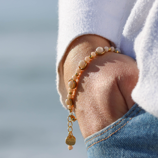 Le bracelet Yeti, doré orné de perles en verre beige capte la lumière comme une douce brise d'été. Subtil et raffiné, il joue avec les reflets dorés pour évoquer l'éclat du soleil sur l'eau. Chaque perle en verre ajoute une touche de brillance. À porter seul ou en accumulation, ce bijou insuffle un esprit de vacances intemporel, parfait pour prolonger l'été.