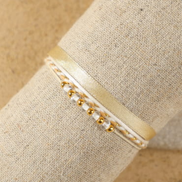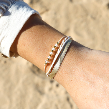 Le bracelet Yeti, doré orné de perles en verre transparent capte la lumière comme une douce brise d'été. Subtil et raffiné, il joue avec les reflets dorés pour évoquer l'éclat du soleil sur l'eau. Chaque perle en verre ajoute une touche de brillance. À porter seul ou en accumulation, ce bijou insuffle un esprit de vacances intemporel, parfait pour prolonger l'été.