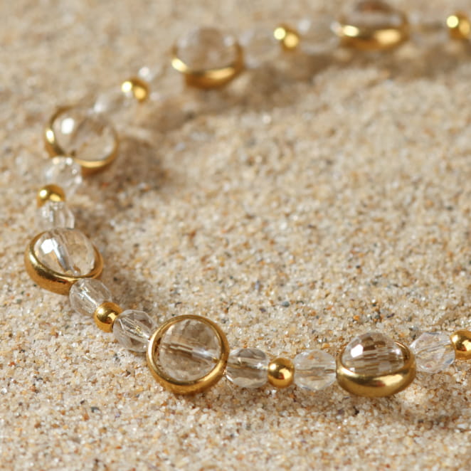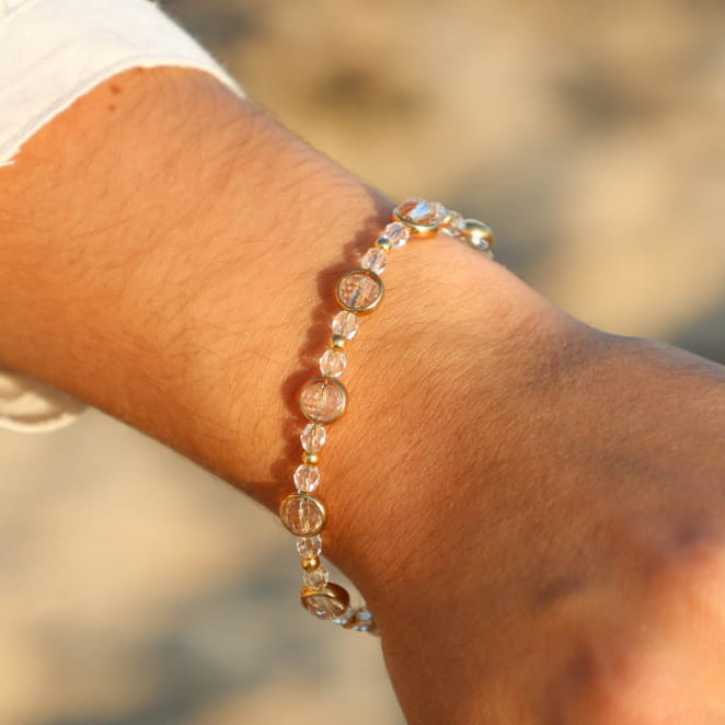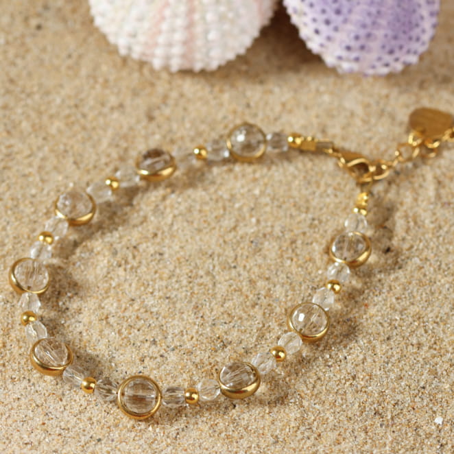 Le bracelet Yeti, doré orné de perles en verre transparent capte la lumière comme une douce brise d'été. voir plus