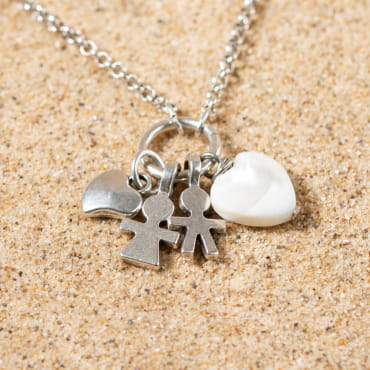 Découvrez la broche Famiglia, un bijou fantaisie argenté avec des pendentifs en nacre blanche. voir plus