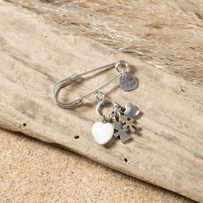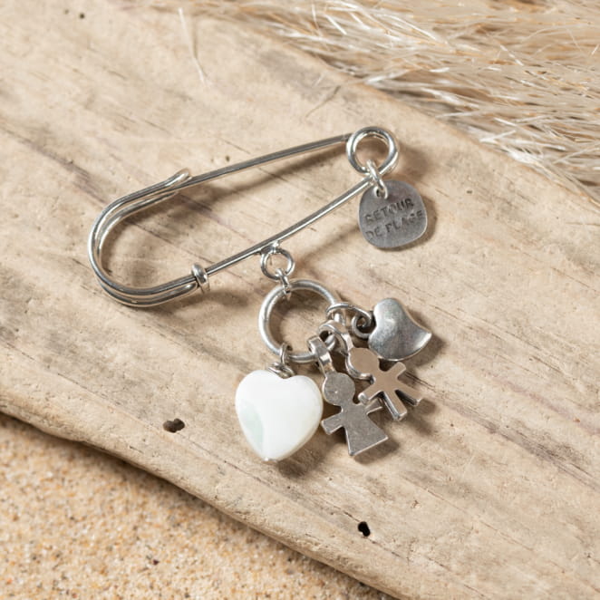 Découvrez la broche Famiglia, un bijou fantaisie argenté avec des pendentifs en nacre blanche. Arborant des motifs cœurs et bonhommes, elle incarne l'amour et l'unicité. Son design élégant ajoute une touche de sophistication à chaque tenue. Parfait pour exprimer votre style avec une pointe de charme, la broche Famiglia est un accessoire incontournable.