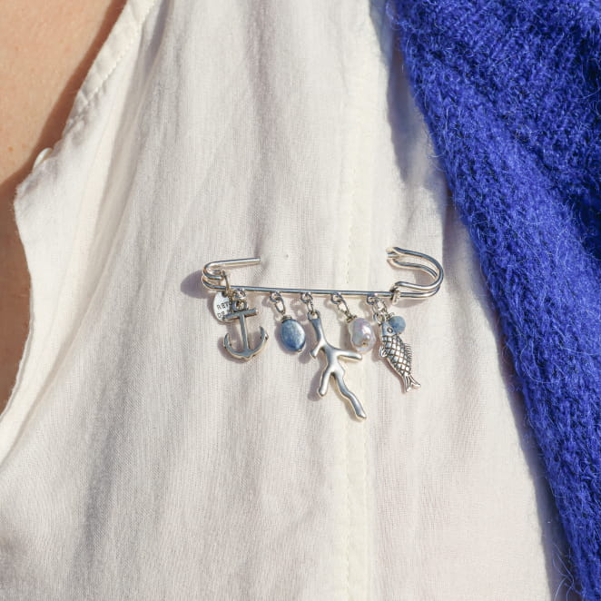 Plongez au cœur de l'univers marin avec notre broche pour femme Méditerranée. Cette broche artisanale, où la cyanite bleu se marie parfaitement avec la pureté des perle naturelle blanche. Ornée d’une ancre, d’un poisson et de corail argentés, elle évoque les trésors cachés des fonds marins. Un bijou parfait pour sublimer une veste, un manteau ou une écharpe, et célébrer l’artisanat français inspiré par l’océan.