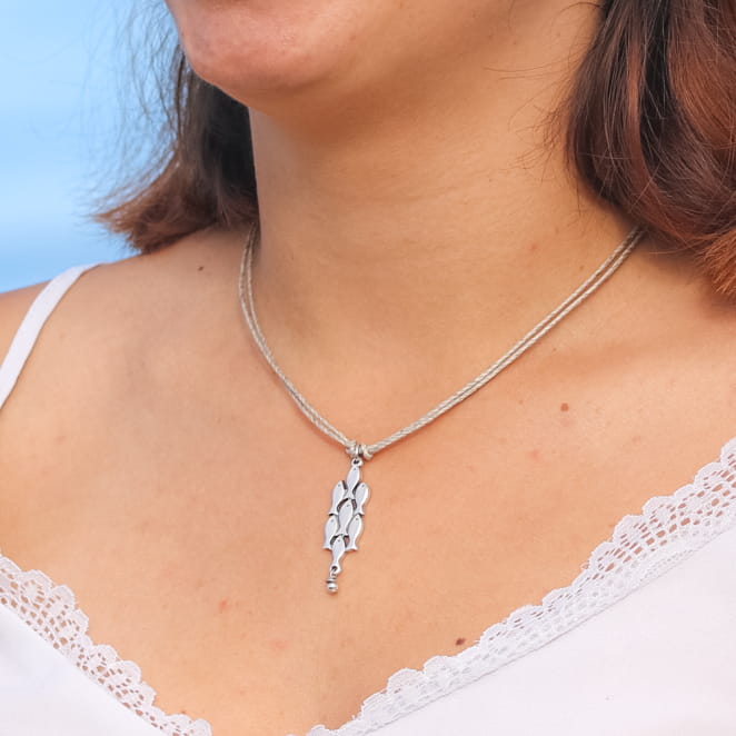 Quoi de mieux que ce collier Banc pour vous rappeler vos vacances passées en bord de mer ? Symbole de Retour de Plage, les poissons argentés et le cordon en lin vous permettent de vous évader tout en apportant une délicate touche marine à votre visage.