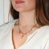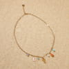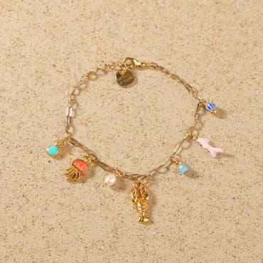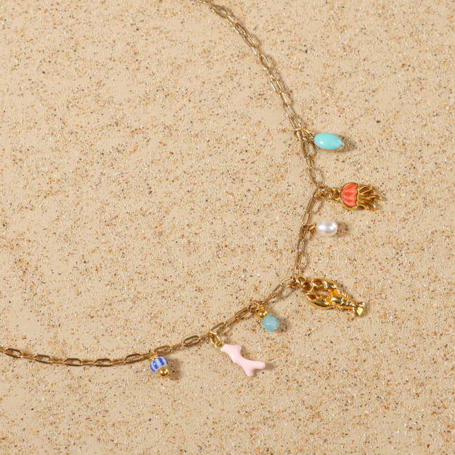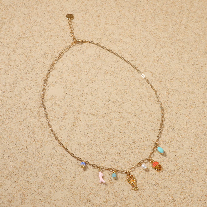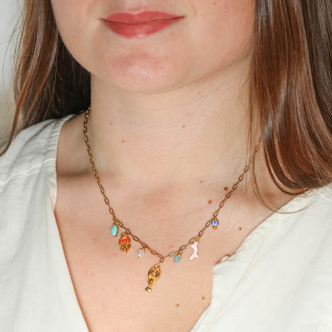 Découvrez le collier Bandeloro, qui sent bon les vacances ! Monté sur une chaîne dorée, il affiche fièrement ses breloques colorées et pleines de fantaisie : un homard doré, une méduse corail, des perles nacrées ou turquoise… Tout un petit monde marin suspendu autour de votre cou ! Un bijou lumineux et joyeux.