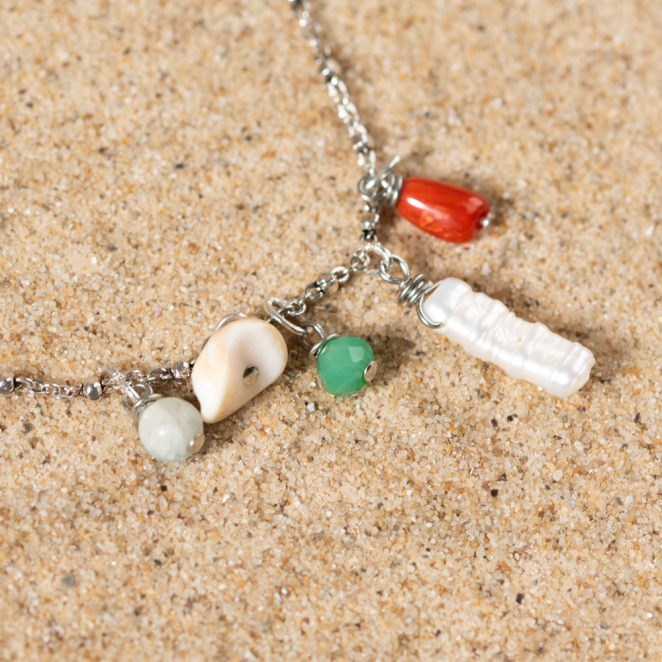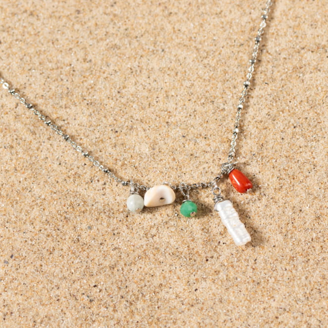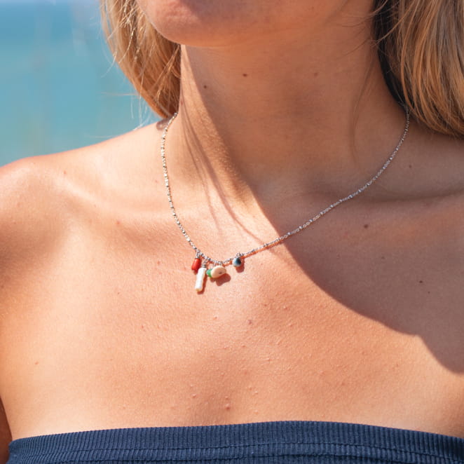 Découvrez le collier pour femme Bastia, un bijou incontournable ! Sa chaîne argentée, ornée de pendentifs rouge, blanc et vert, intègre des éléments naturels comme la nacre et le coquillage. Inspiré des couleurs corses, ce collier unique évoque la beauté de l'île et ajoute une touche de raffinement à toute tenue.