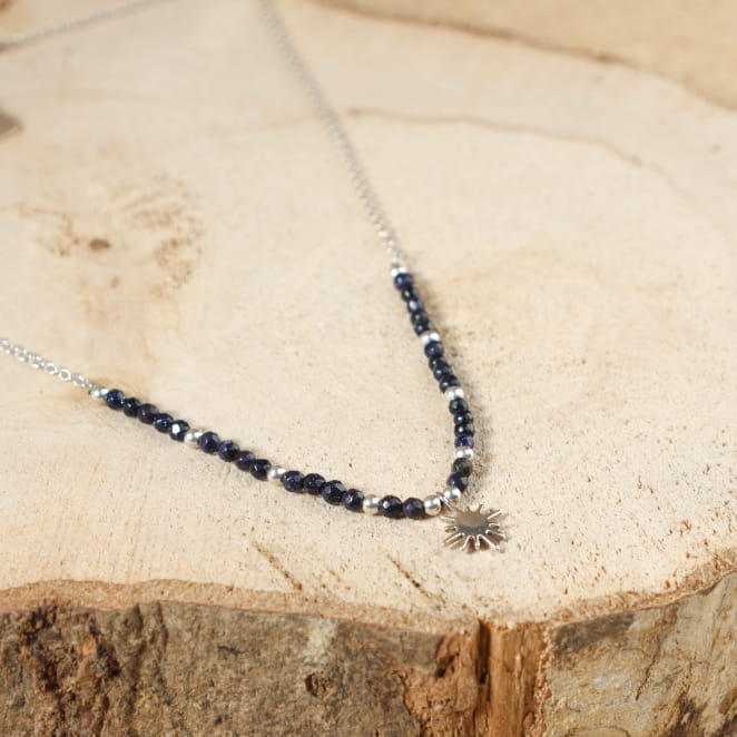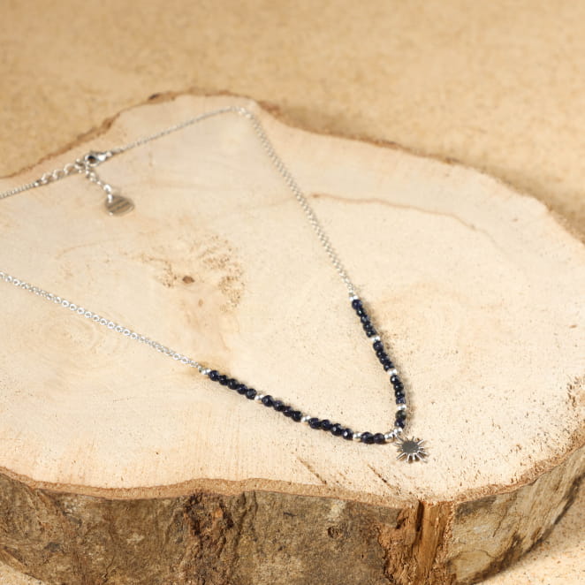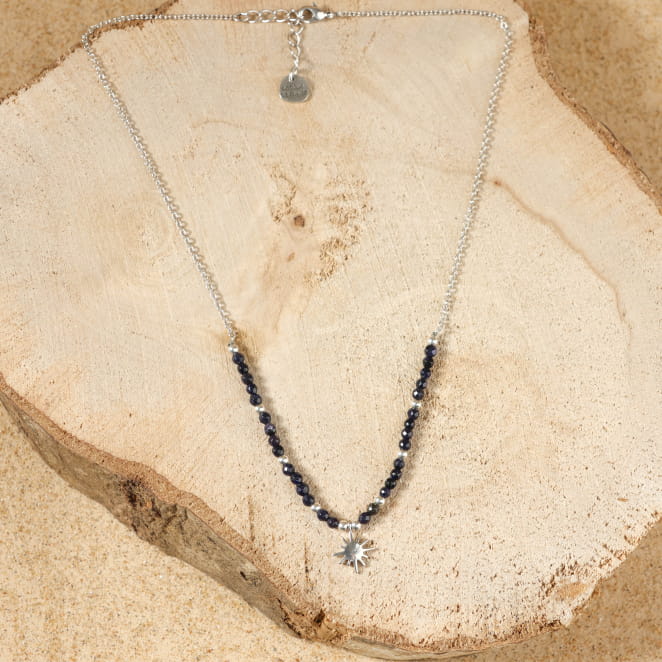 Plongez dans la délicatesse avec le collier Binibeca, une fine chaîne argentée avec des perles en pierre de sable bleu marine scintillantes et au bout un pendentif en forme d'étoile capturant la lumière du ciel. Ce bijou pour femme évoque la beauté brillante de la nuit, un collier unique comme une étoile filante. Le collier en perles pour femme Binibeca est léger et raffinée apportant tendresse et style discret !