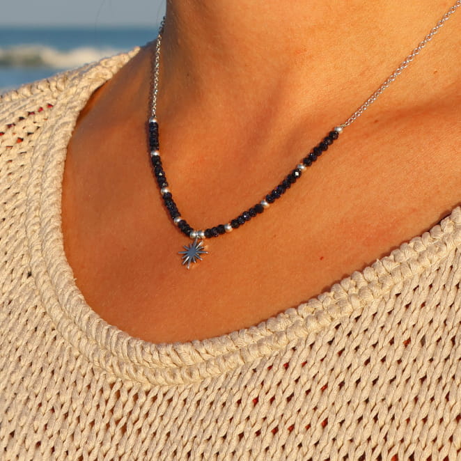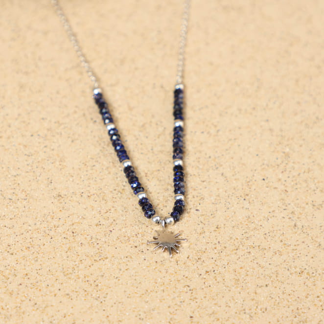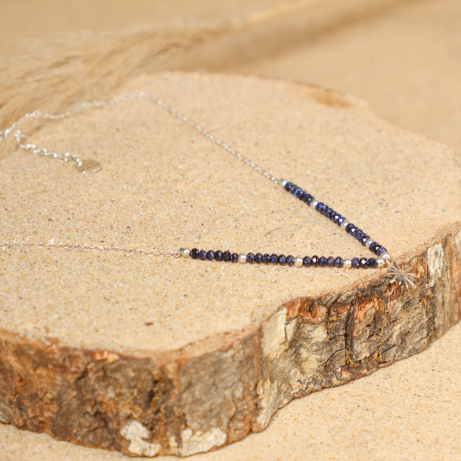Plongez dans la délicatesse avec le collier Binibeca, une fine chaîne argentée avec des perles en pierre de sable bleu marine scintillantes et au bout un pendentif en forme d'étoile capturant la lumière du ciel. Ce bijou pour femme évoque la beauté brillante de la nuit, un collier unique comme une étoile filante. Le collier en perles pour femme Binibeca est léger et raffinée apportant tendresse et style discret !