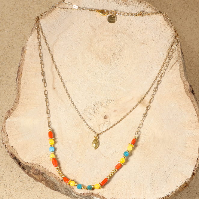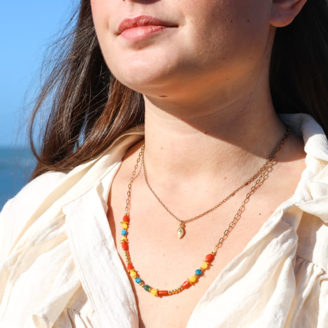 Ajoutez une touche solaire à votre décolleté, avec le collier Bologne. Un collier léger, doré et coloré, qui capte la lumière et réveille les tenues d’été. Sa chaîne fine accueille un mélange joyeux de perles jaunes, corail et bleu. Un bijou qui fait la différence, qui sent bon les jours ensoleillés.