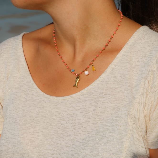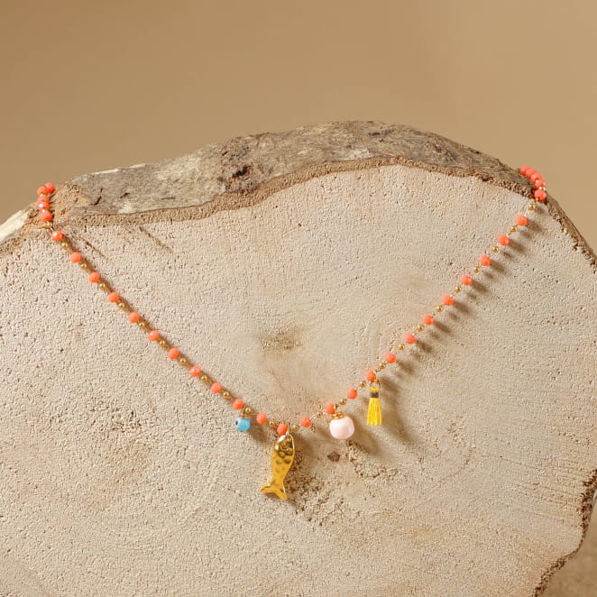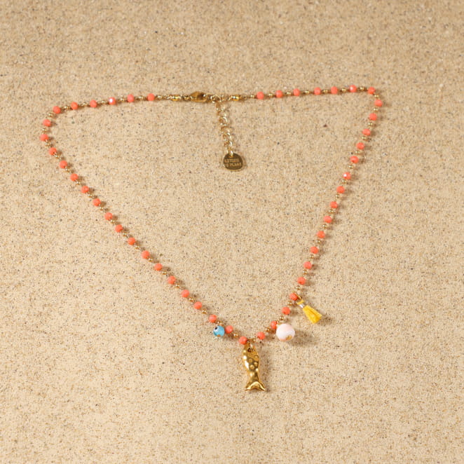Coup de coeur pour le collier Bonita, une chaine fine ponctuée de perles corail et de breloques pleines de fantaisie ! voir plus