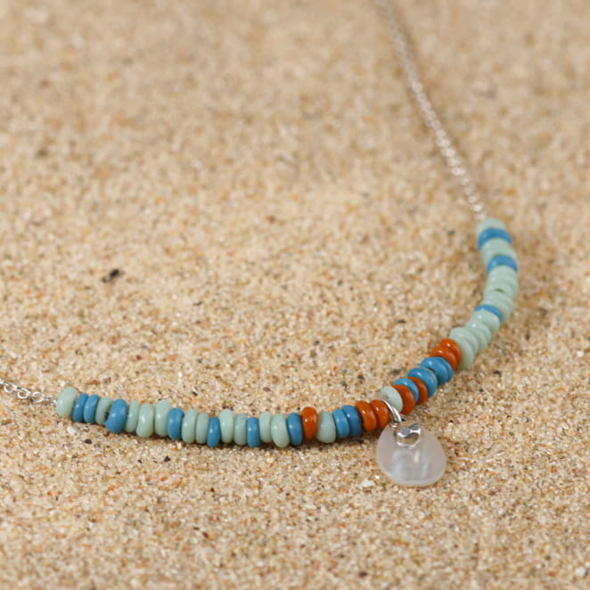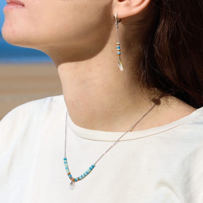 Cap sur le soleil avec le collier en perles pour femme Cap, un bijou discret et léger. Ce joli et raffiné collier chaîne est composé de délicates petites perles bleu ciel multicolore, il apporte légèreté à votre buste tout en apportant éclat grâce à ses pendentifs en forme de goutte en nacre blanche réajuster par une petite perle en argent scintillante. Le collier Cap apporte lumière et finesse toute en discrétion.
