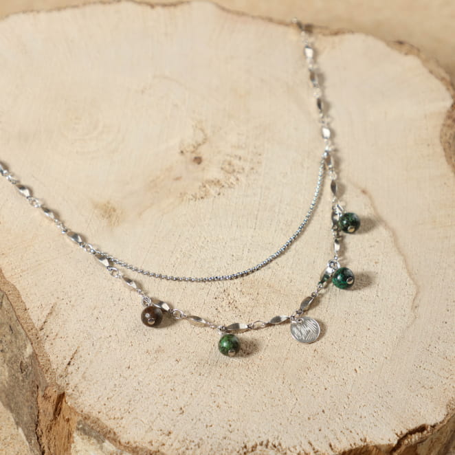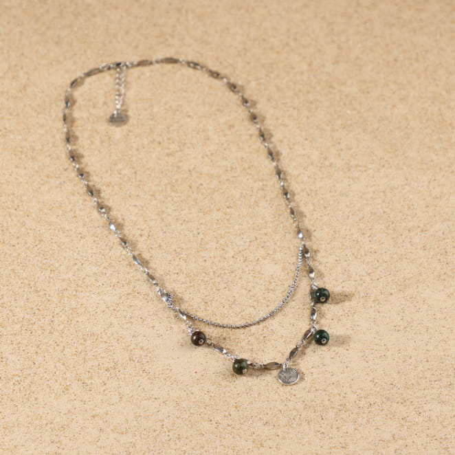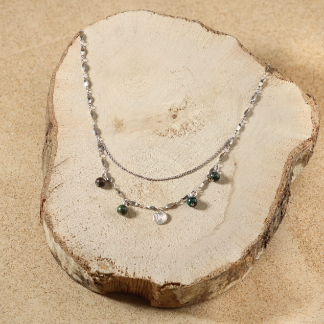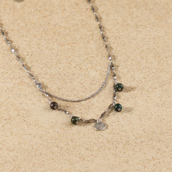 Glissez un éclat d’océan autour de votre cou. Le collier pour femme Casta associe des perles en pierres vertes à une fine médaille. Ce collier multi-chaîne est léger et lumineux, il accompagne aussi bien les journées ensoleillées que les soirées douces en bord de mer. Il saura sublimer votre tenue !