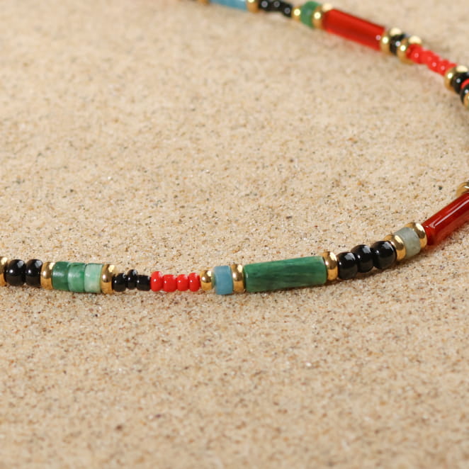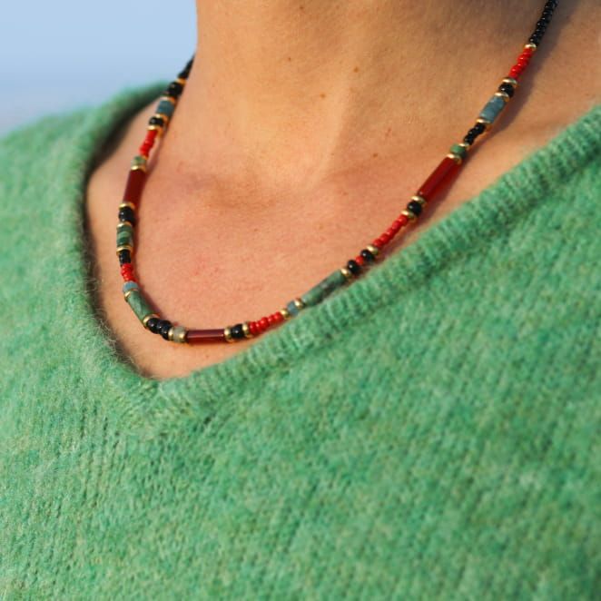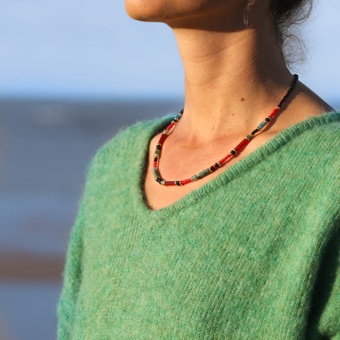 Découvrez le mystère et l'élégance du collier Conque ! Plongez dans un univers à la fois profond et envoûtant avec ce collier, un bijou aux nuances profondes qui mélange perles de rocaille et pierres naturelles. Composé de perles de verre noires et rouges, ce collier est sublimé par des perles en agate et en jade, deux pierres semi-précieuses aux vertus apaisantes et protectrices. Chaque détail de ce bijou artisanal est conçu pour apporter une touche de caractère et d'élégance à vos tenues. Le contraste entre les perles noires et les perles rouges évoque la passion et l'énergie. Chaque pierre confère à ce bijou un caractère unique, renforçant son charme mystérieux. Entièrement fabriqué à la main en France, il témoigne d'un savoir-faire artisanal de qualité.