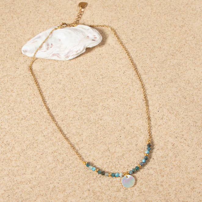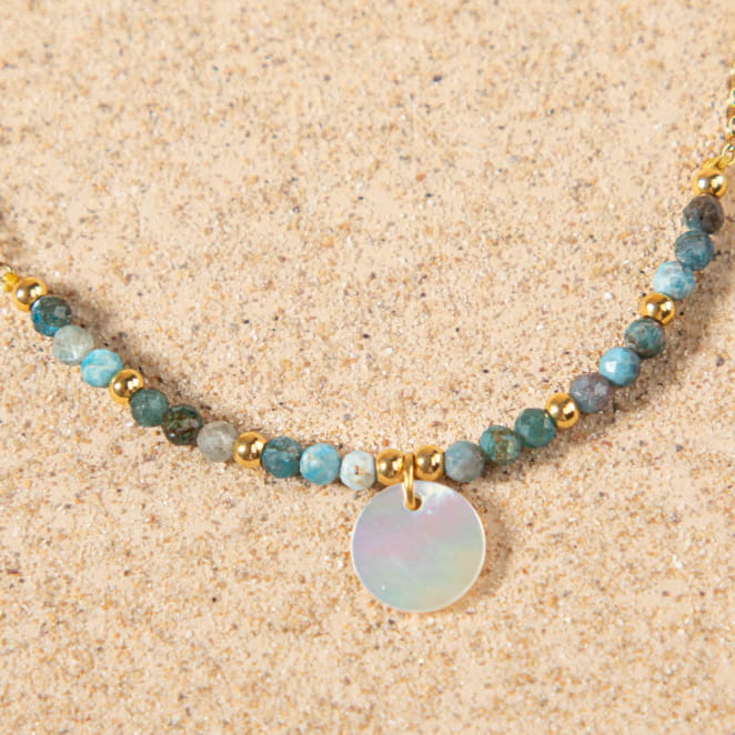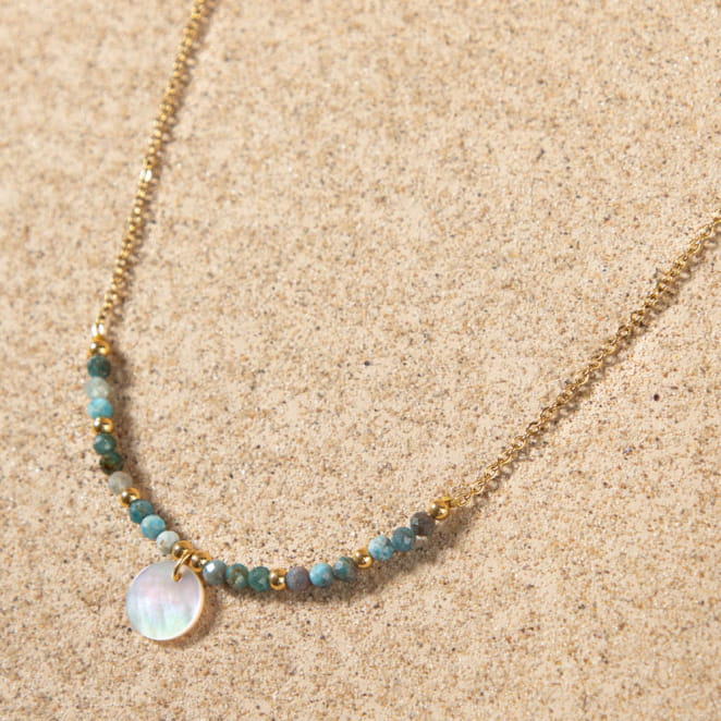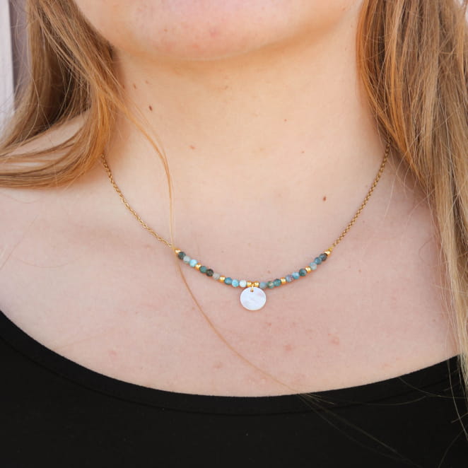 Le collier Core sera vous faire succombez au charme de celui ci, en doré, orné de petites perles turquoises facettées qui capturent la lumière à chaque mouvement. Finement travaillé, ce bijou discret en chaîne s'accompagne d'un délicat pendentif en nacre blanche, ajoutant une touche élégante et subtile.