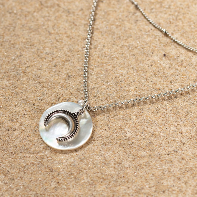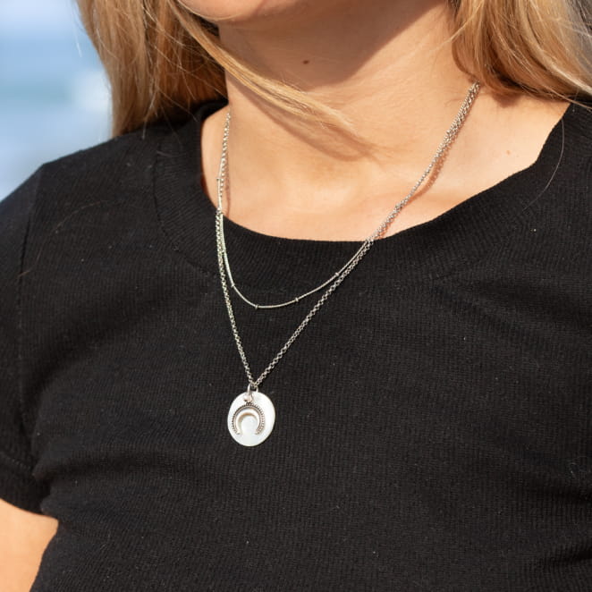 Découvrez le collier multirang Corne : un bijou argenté sophistiqué avec un pendentif rond en nacre blanche. voir plus