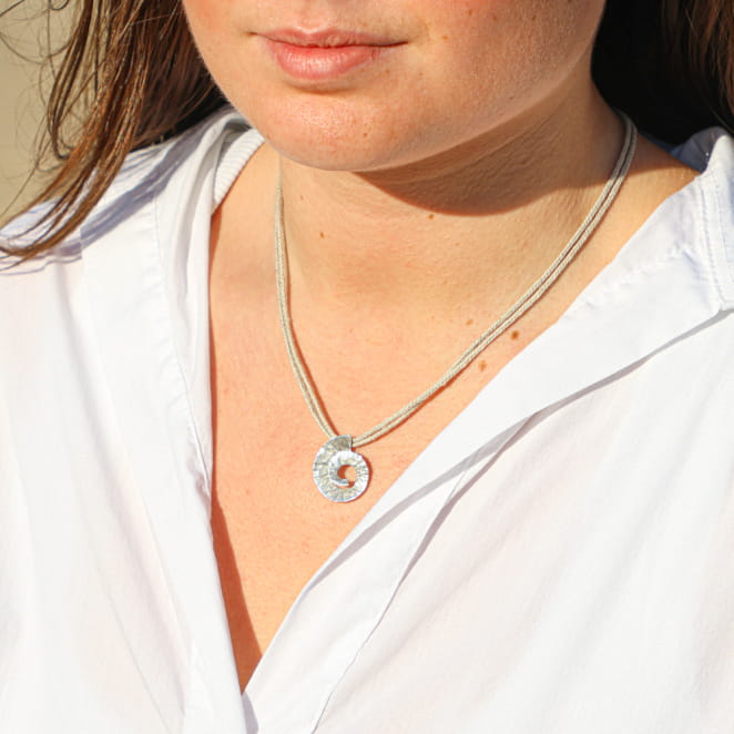 Misez sur la simplicité élégante avec le collier Cyclone, qui joue avec les contrastes entre naturel et métal. Son pendentif tourbillon argenté fait écho à la lumière, suspendu à deux cordons de lin beige pour une finition à la fois brute et raffinée. C'est un collier aux lignes pures, équilibre des textures et design graphique.