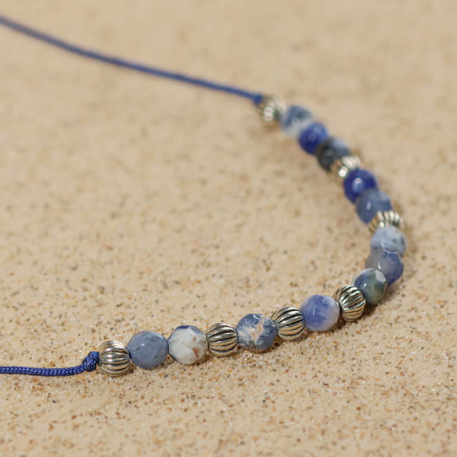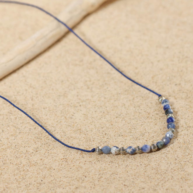 Craquez pour le collier Dabia, en cordon bleu marine, ponctué de perles de sodalite bleu et de perles argentées. voir plus