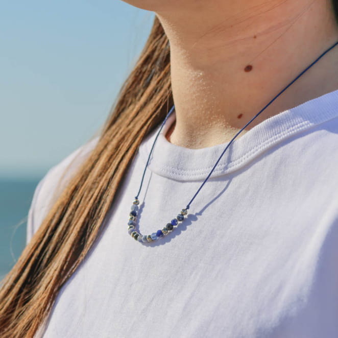Craquez pour le collier Dabia, en cordon bleu marine, ponctué de perles de sodalite bleu et de perles argentées. Une création pleine de douceur et de caractère, où chaque détail raconte une histoire simple et raffinée. Authentique et naturel, ce bijou capture l’essence d’un vent léger et d’un sable chaud sous vos pas.