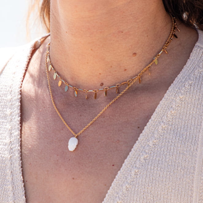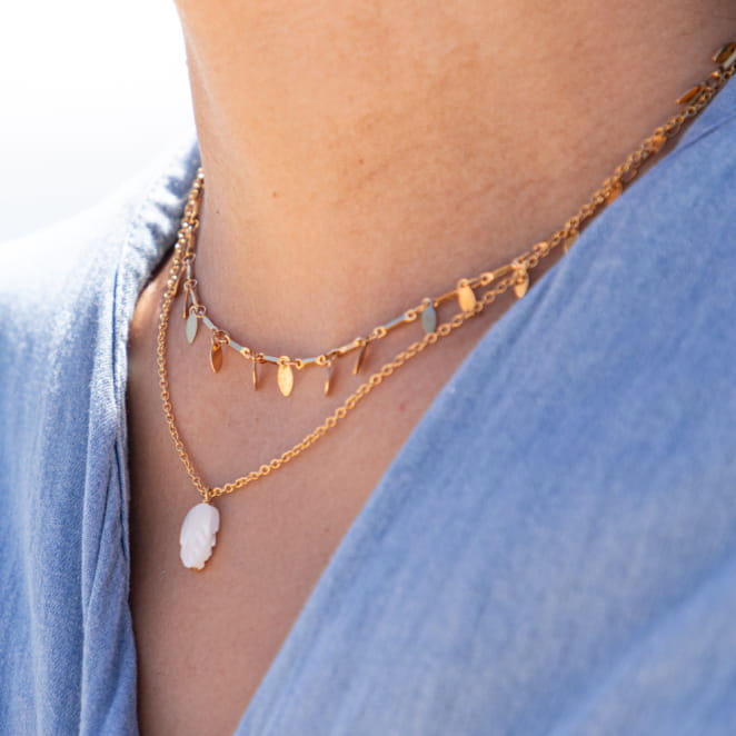 Osez une touche d'originalité tout en délicatesse avec le collier Double, un bijou associant l'éclat lumineux d'une petite feuille en nacre à la brillance de deux chaînes aux mailles distinctes dorées. Agréable à porter avec l'ensemble de vos tenues, de journée comme de soirée !