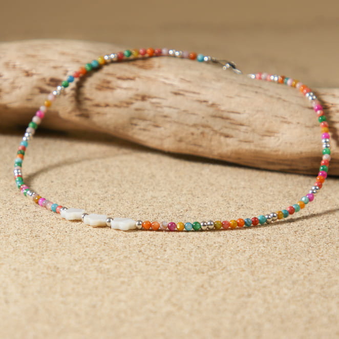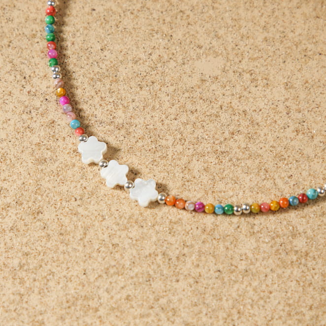 Le collier pour enfant Casoria est un adorable accessoire qui égayera le cou de votre petit. Composé de perles multicolores et argentées, orné de délicates perles en nacre en forme de fleur blanche, ce collier offre une combinaison parfaite de charme et de couleur.