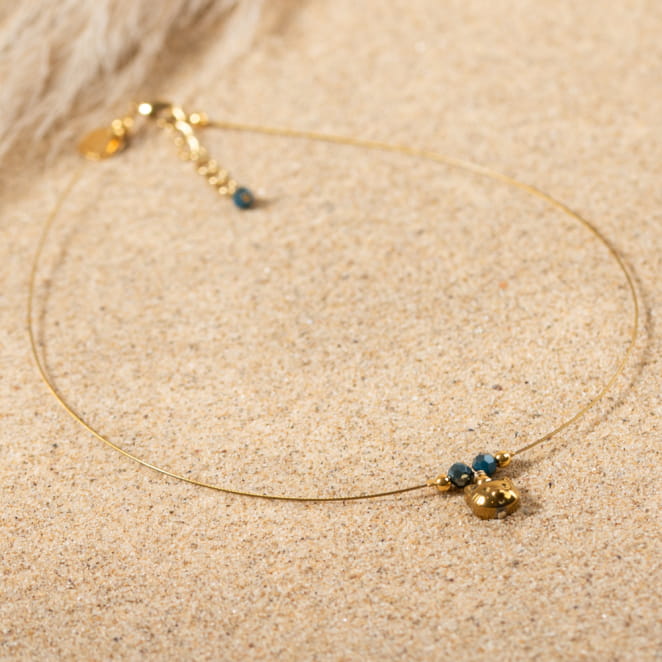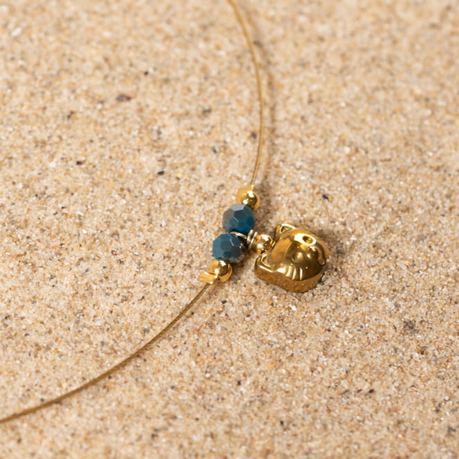 Découvrez le collier Chat, l'accessoire adorable pour les enfants ! Fabriqué avec un câble en bronze robuste, orné d'un délicat pendentif en tête de chat et de perles en verre bleu pétrole, ce collier apporte une touche ludique à n'importe quelle tenue.