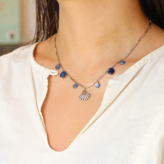 Retrouvez l’esprit apaisant des bords de mer avec le collier pour femme Estany, une pièce raffinée qui allie douceur et naturel. Ce collier pour femme marie une chaîne argentée à des perles en lapis lazuli bleu et en cyanite bleu, sublimées par un pendentif en forme de coquillage argenté. ce bijou peut aussi être associé aux boucles d'oreilles Estany pour une parfaite harmonie !