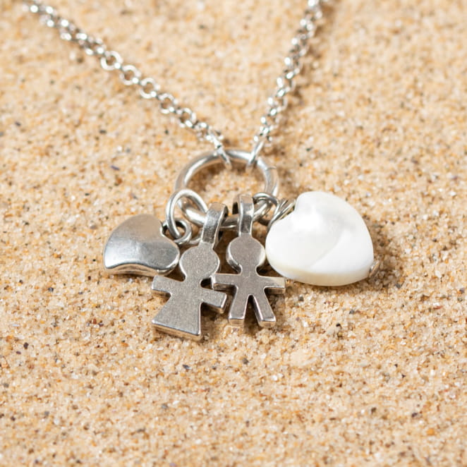 Plongez dans l'élégance avec le collier Famiglia, une pièce sophistiquée ornée de pendentifs en nacre blanche et argenté. Ses motifs en forme de cœur et de bonhomme évoquent l'amour et l'individualité. Ce bijou saisissant ajoute une touche de charme à votre style quotidien. Exprimez-vous avec grâce et originalité grâce au collier Famiglia, un accessoire incontournable pour toute occasion.