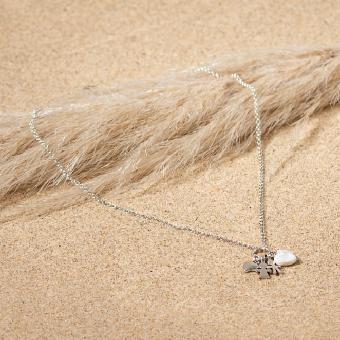 Plongez dans l'élégance avec le collier Famiglia, une pièce sophistiquée ornée de pendentifs en nacre blanche et argenté. voir plus