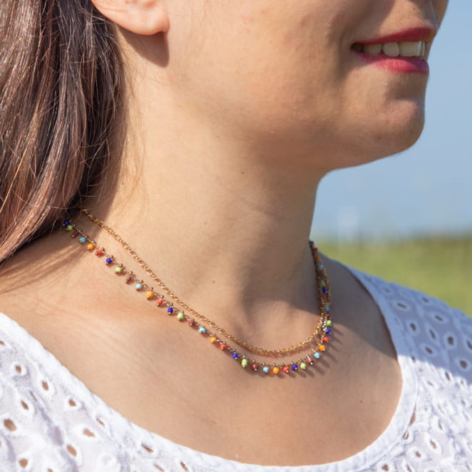 Osez mettre de la couleur dans votre vie avec le collier artisanal Folk ! Un bijou idéal pour ajouter une note de gaieté à votre look avec ses perles en métal multicolores aux couleurs vibrantes et joyeuses. Un collier multirangs à porter au quotidien !