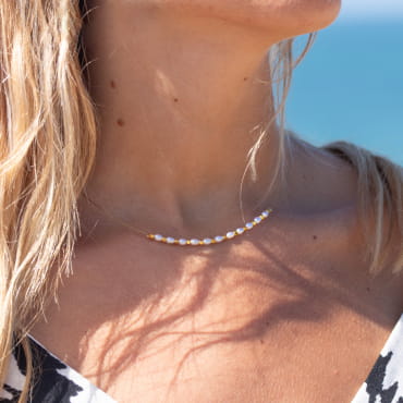 Succombez à la douceur du collier Guimauve, un bijou aux teintes pastel qui sent bon l’été. Laissez-vous envelopper par l’harmonie de ses perles rose poudré, blanc givré et doré lumineux, délicatement assemblées sur une chaîne fine doré à l’or fin. Chaque élément évoque la lumière douce des fins d’après-midi au bord de l’eau. Parfait pour illuminer vos tenues estivales.