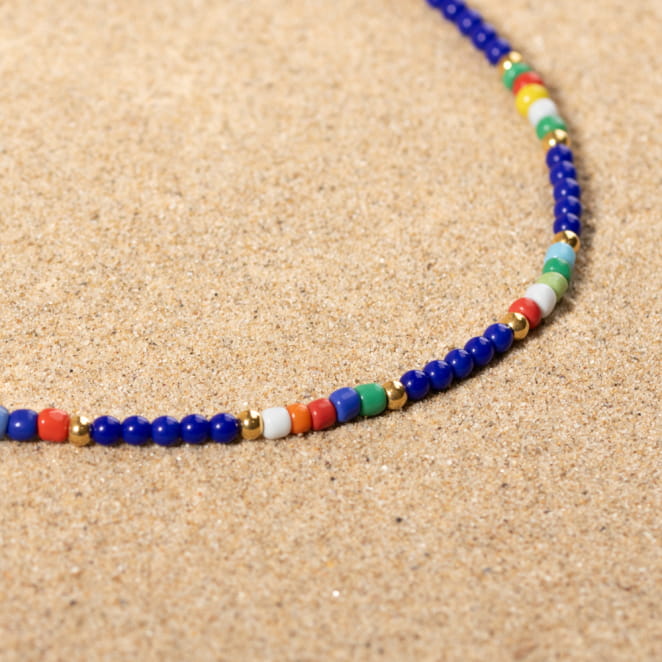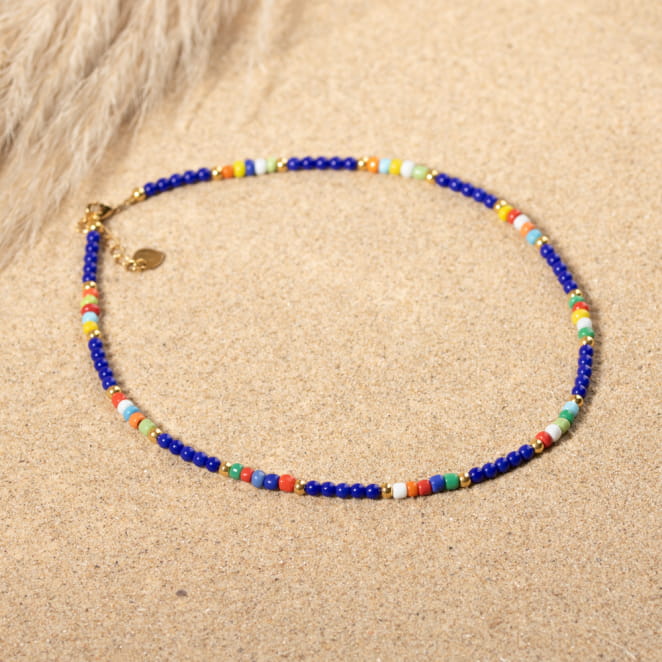 Le collier pour femme Hardy combine harmonieusement des perles bleu dur, multicolores et dorées, offrant un éclat vibrant et raffiné. voir plus