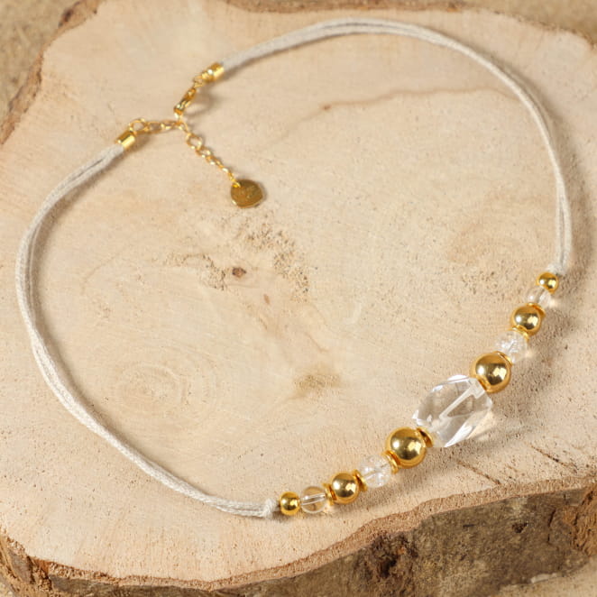 Laissez-vous séduire par notre collier Kenitra, un bijou naturel et lumineux. Ce collier pour femme illumine votre style avec ses perles dorées éclatantes, un accessoire original et tendance. Il associe avec élégance des perles en cristal transparent à un cordon en lin beige, pour un look à la fois raffiné et bohème. La perle centrale, en cristal, évoque les reflets doux et scintillants de l’eau en bord de mer.