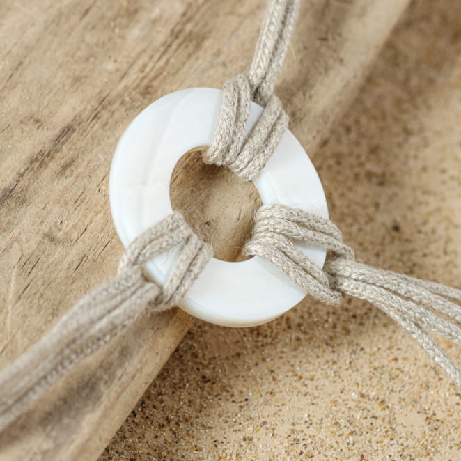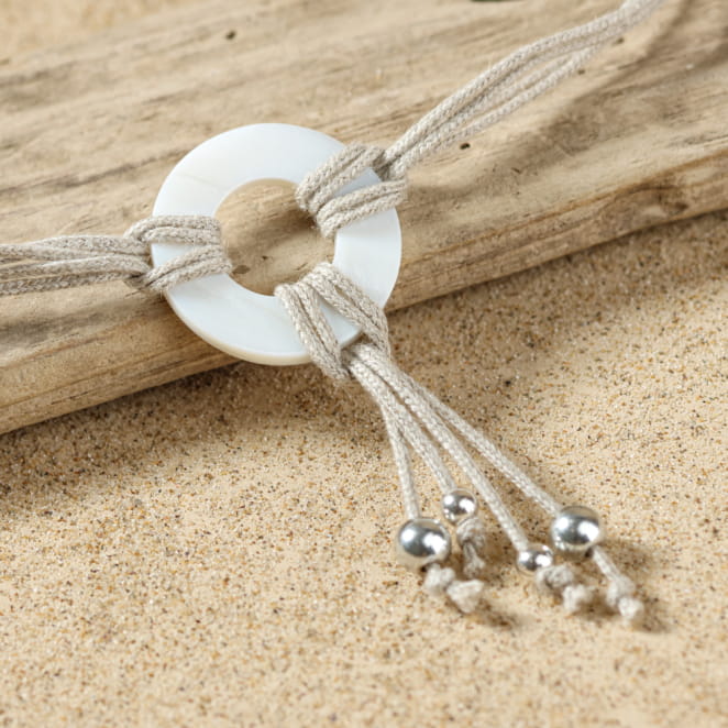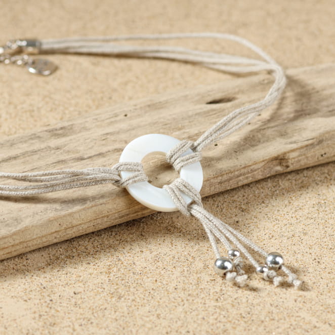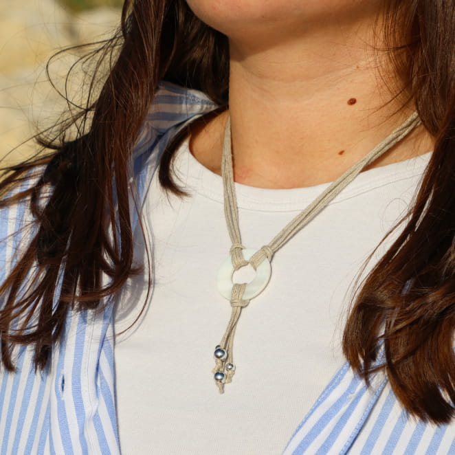 Évoquant la douceur du sable, Le collier Lamego, multi-brins en lin naturel déploie un charme sauvage et raffiné. En son centre, un anneau de nacre capte la lumière, tandis que des brins de lin se prolongent en un pendentif léger, orné de petites perles argentées, comme des éclats de soleil sur le rivage. Idéal pour celles qui recherchent un bijou à la fois naturel et élégant.