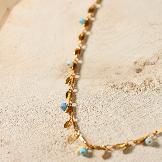 Découvrez notre collier pour femme Laurier, une création délicate et lumineuse qui évoque l’esprit nature et le charme des vacances au bord de mer. Ce collier pour femme allie avec harmonie des pétales dorés et des perles en verre bleues rappelant les reflets de l’océan. Parfait pour apporter une touche d’évasion et de douceur à vos tenues, ce bijou artisanal, doré à l’or fin 24K, est conçu pour sublimer chaque instant.