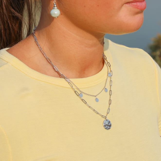 Sublimez votre tenue avec le collier Loustic, un collier argenté au design aérien. Ses deux chaînes s’harmonisent avec légèreté : l’une parsemée de petits médaillons, l’autre rehaussée d’une médaille plus marquée. Un bijou tout en finesse, à adopter au gré de vos envies.