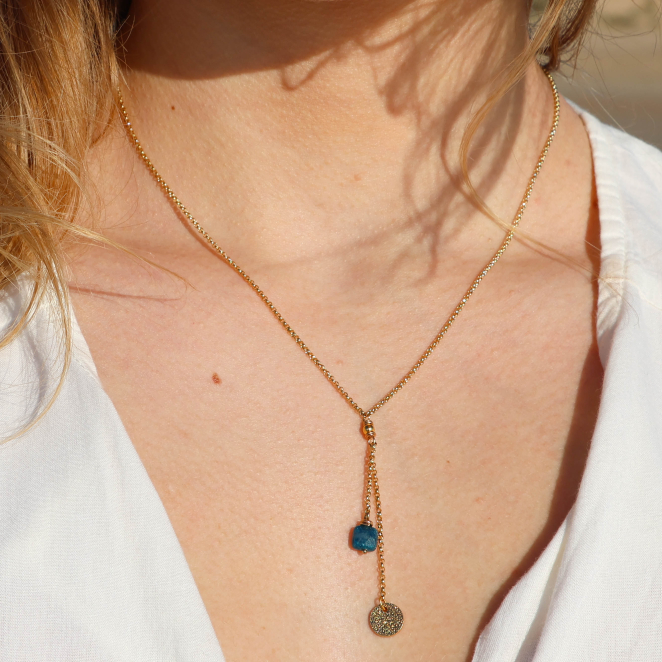 Craquez pour le sublime collier Lumineuse, un collier intemporel à porter au quotidien avec tous vos looks. La délicate chaîne dorée, ornée d'une perle carrée en apatite bleu et d'un petit médaillon doré, confère à ce collier une élégance discrète. Un accessoire charmant et unique qui complète parfaitement toutes vos tenues, ajoutant une touche sophistiquée à votre allure.