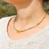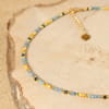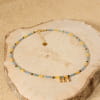 Retrouvez notre collier pour femme Meline, un bijou artisanal qui évoque la sérénité des vacances et la douceur des paysages marins. Ce bracelet, orné de perles en verre jaune et en cyanite bleu, est agrémenté de pendentifs en forme de poisson dorés à l’or fin 24K. Un accessoire fait main, parfait pour apporter une touche de lumière et d’authenticité à votre style.